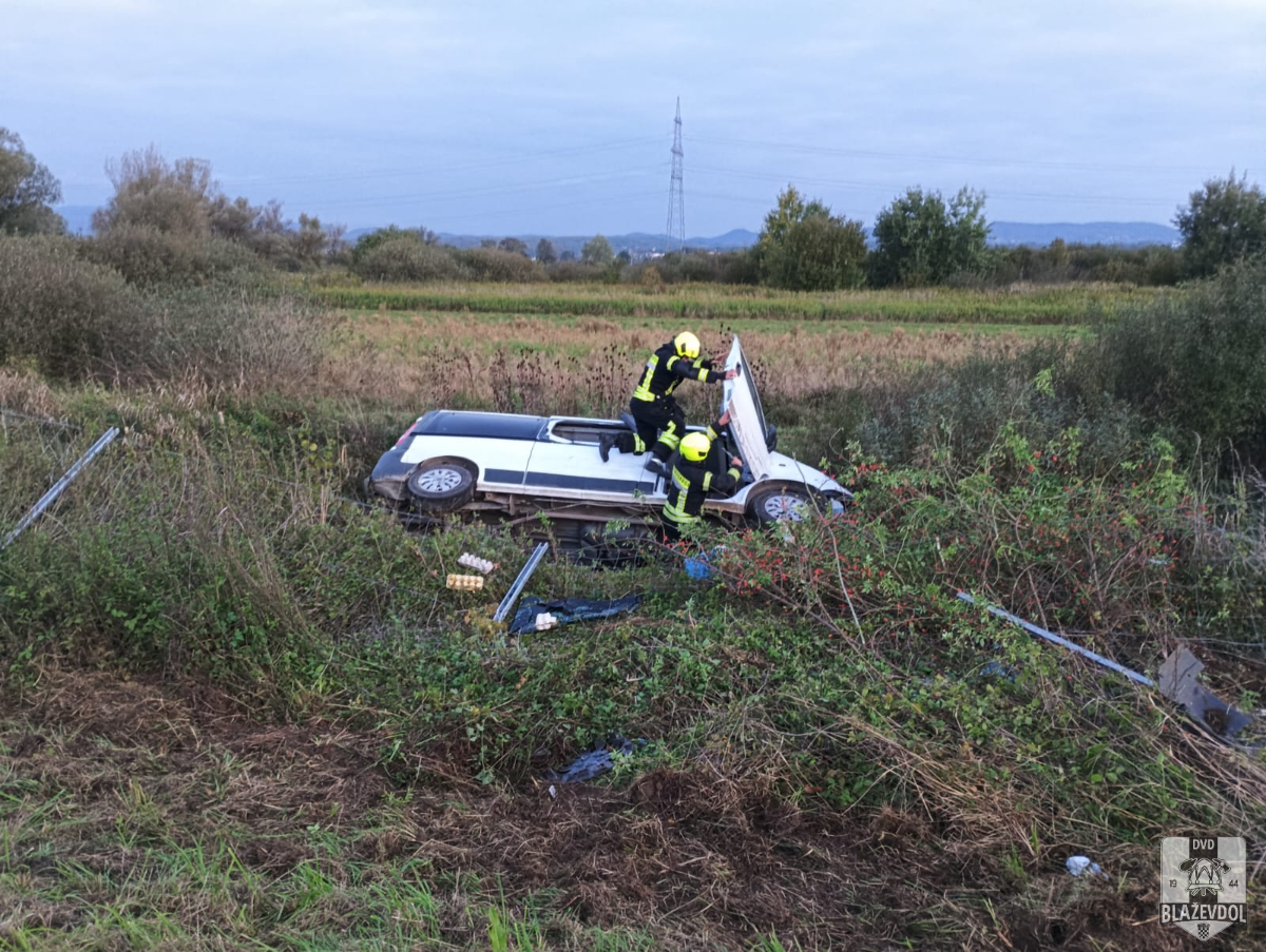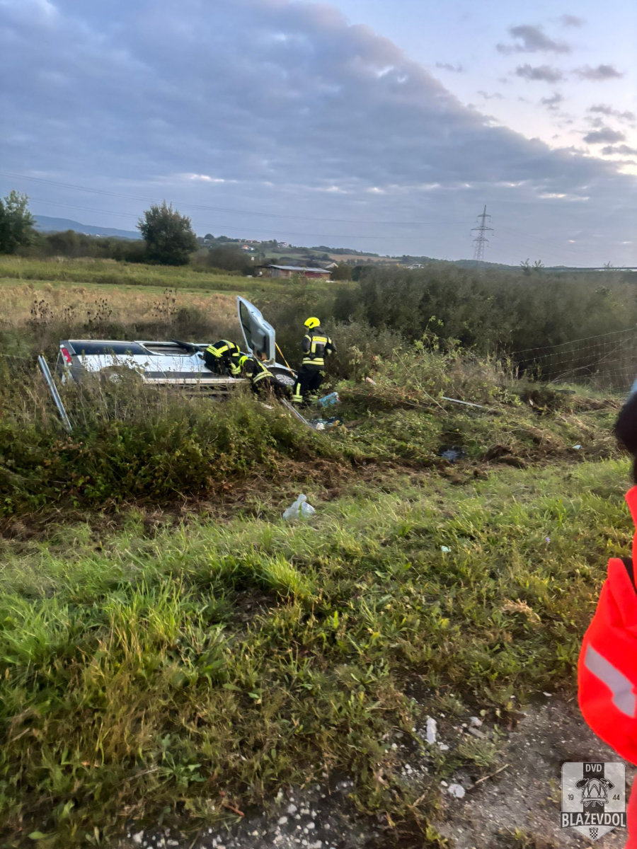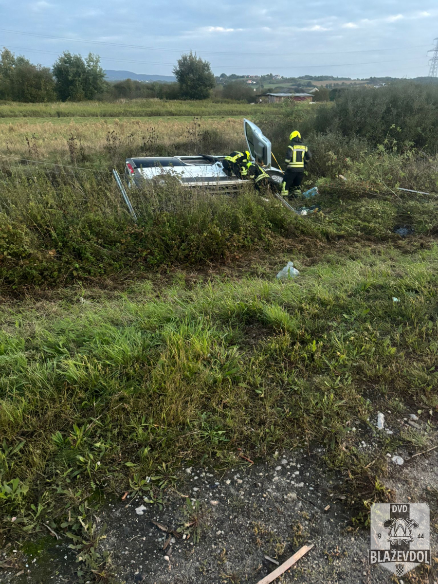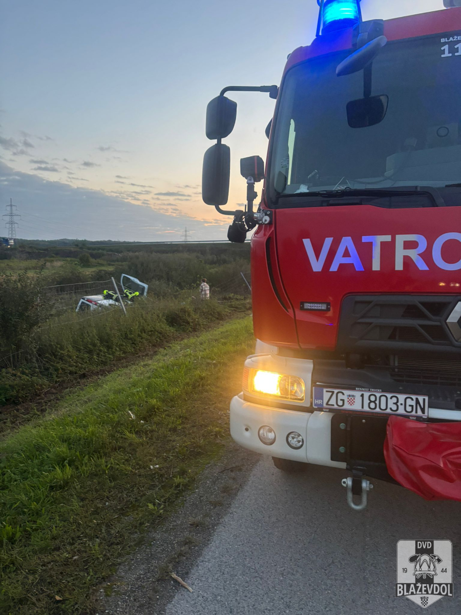 Dana 27.09.2025. u 06:04 od ŽVOC-a primamo dojavu o prometnoj nesreći (kombi sletio s ceste, 2 osobe u vozilu) na 84km A4 autoceste u smjeru Zagreba. Na intervenciju izlazimo s NV Blaževdol 110 i kombi vozilom Blaževdol 104 te 7 operativca (+1 u pričuvi). Po dolasku na lokaciju uočavamo kako je kombi vozilo marke Opel Vivaro bjelovarskih registarskih oznaka sletjelo s prometnice, probilo zaštitnu ogradu te se prevrnulo na bok. Osiguravamo mjesto događaja. Osobe su izvađene iz vozila te su ih preuzeli djelatnici HMP-a. Otpajamo akumulator na vozilu. Na intervenciji također prisutni djelatnici HAC-a i MUP-a. Kraj intervencije u 08:00.